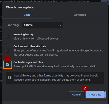 Select Cached Images and files (untick others) and click Clear Data (ensure time range is All Time)