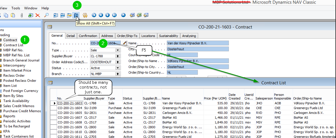 - Change into the Training company, open module Contract, click into the Contract No. field, press F5, click ‘Show All’ in the Nav. filter pane (or use Ctrl+Shift+F7)